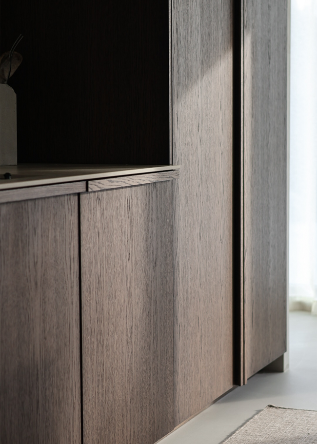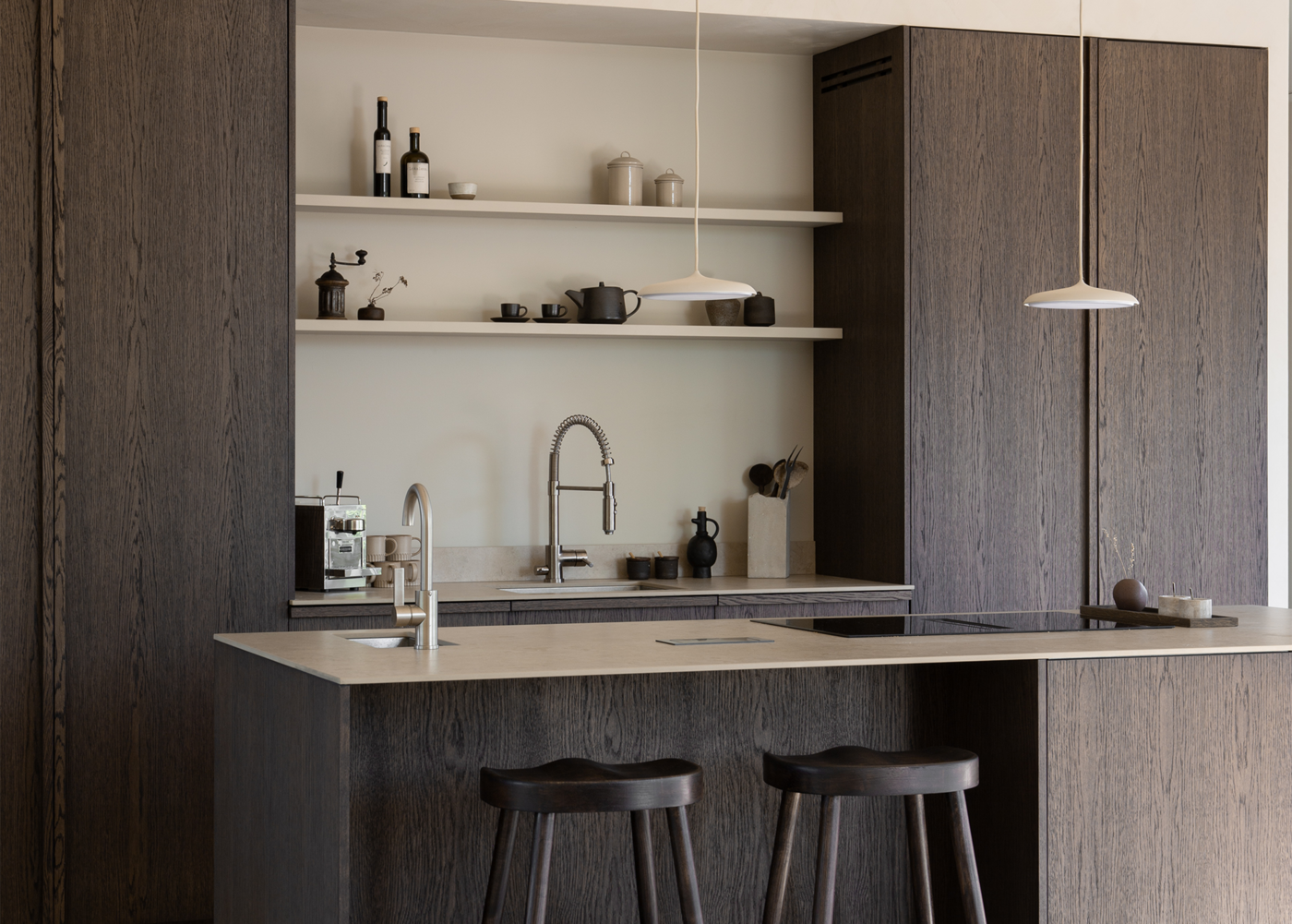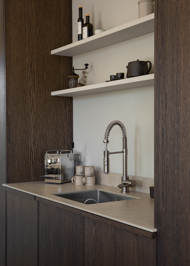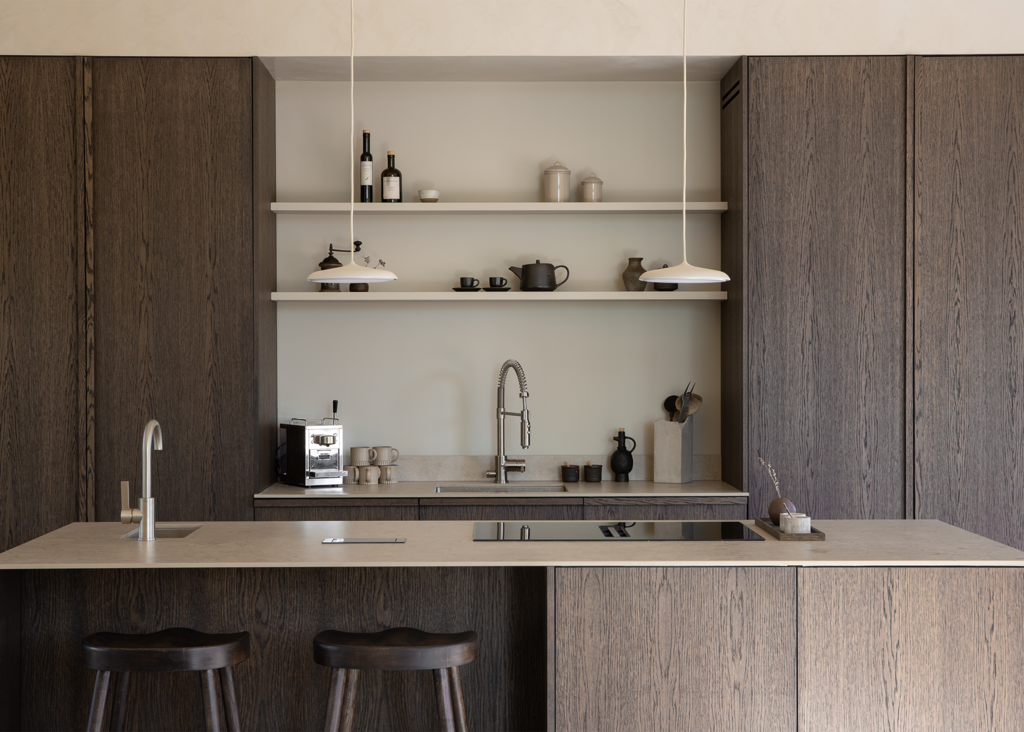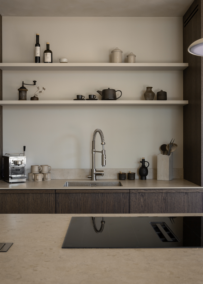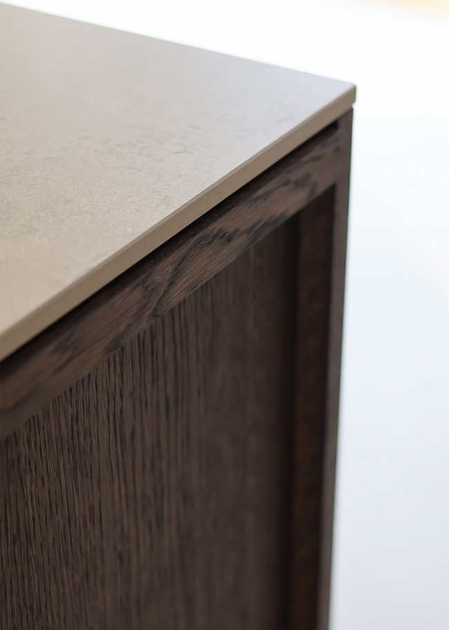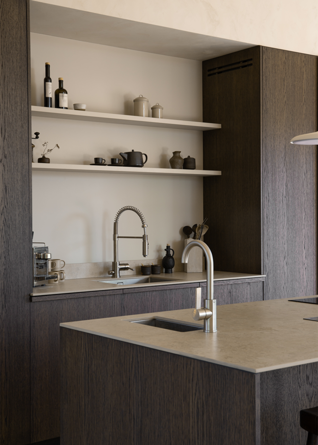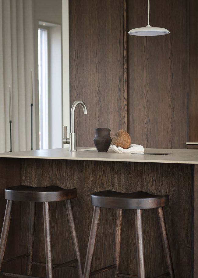 A modern kitchen where the Norrvange Ivory countertop elevates the overall look with its light, warm tone, creating a beautiful contrast against the dark wood fronts. The series is a modern and practical interpretation of the unique character of Gotland limestone in greige tones. With fossil-like details and subtle tonal variations, the series captures the natural variations of Norrvange limestone.