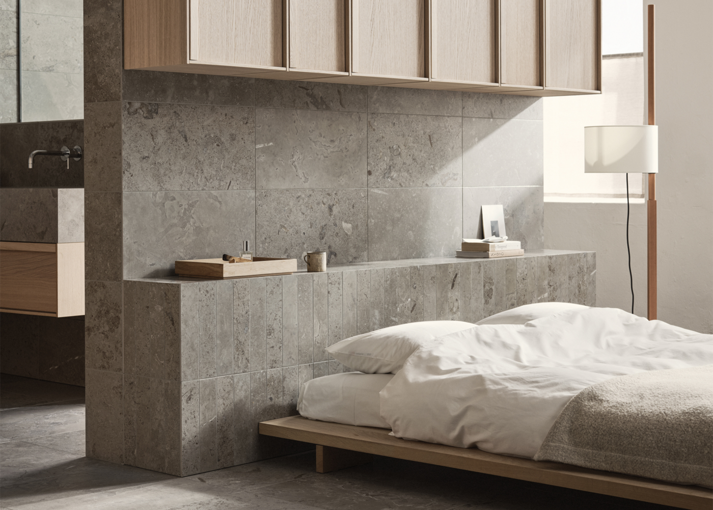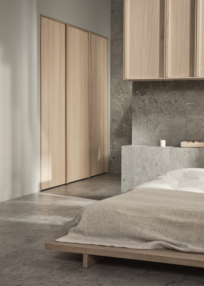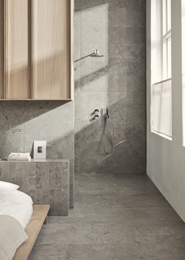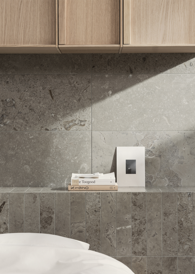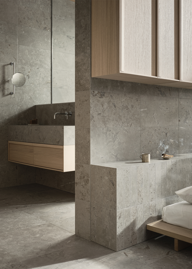 Limestone Select Classic luo tähän retreatiin ylellisen ja harmonisen tunnelman. Luonnon inspiroima pinta luo rauhallisen ympäristön, jossa materiaalin luonne pääsee oikeuksiinsa. Hiottua Honed-pintaa käytetään tässä koossa 07x30 sängynpäädyssä sekä 30x60 seinissä, kun taas lattia on toteutettu koossa 60x60 mattapintaisena. Rikkaan ja vaihtelevan kuviointinsa ansiosta Limestone Select Classic luo erittäin luonnollisen kalkkikivimäisen ilmeen, joka sopii täydellisesti kodin kaikille pinnoille.